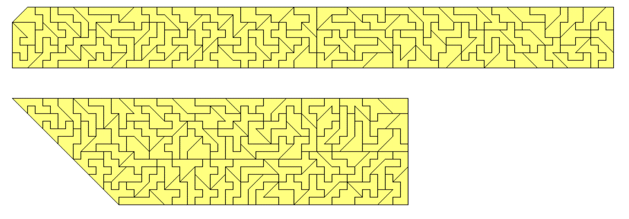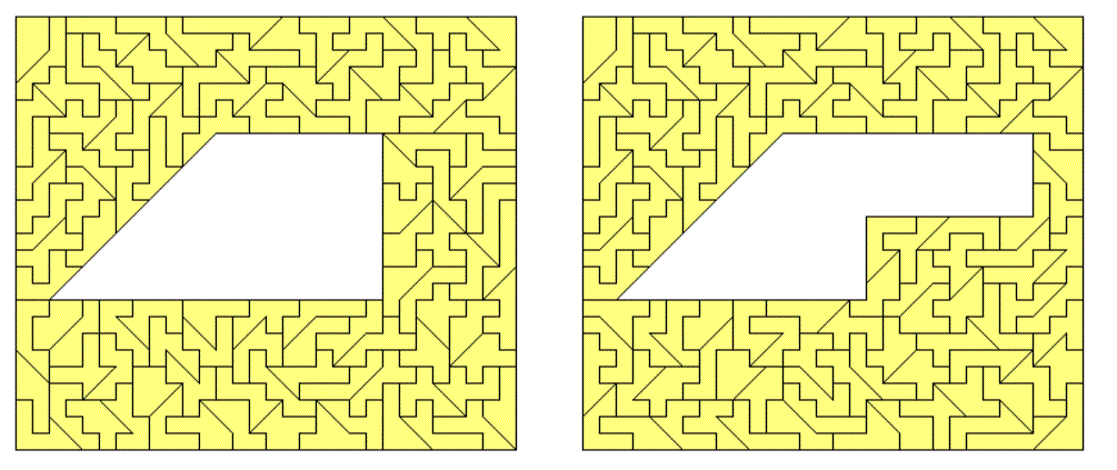 - r even: (r+2)/2 P1-P1 pairs, r/2 P2-P2 pairs, one P1 piece left. The sliced side of the left P1 piece is located at the sliced side of the figure; therefore 233-2-5m white places and 232-3-5m black places are free, and we have the difference 0 between white and black places. This cannot be achieved by (r+2)/2 +r/2 = r+1 pairs, because r is even and r+1 odd.