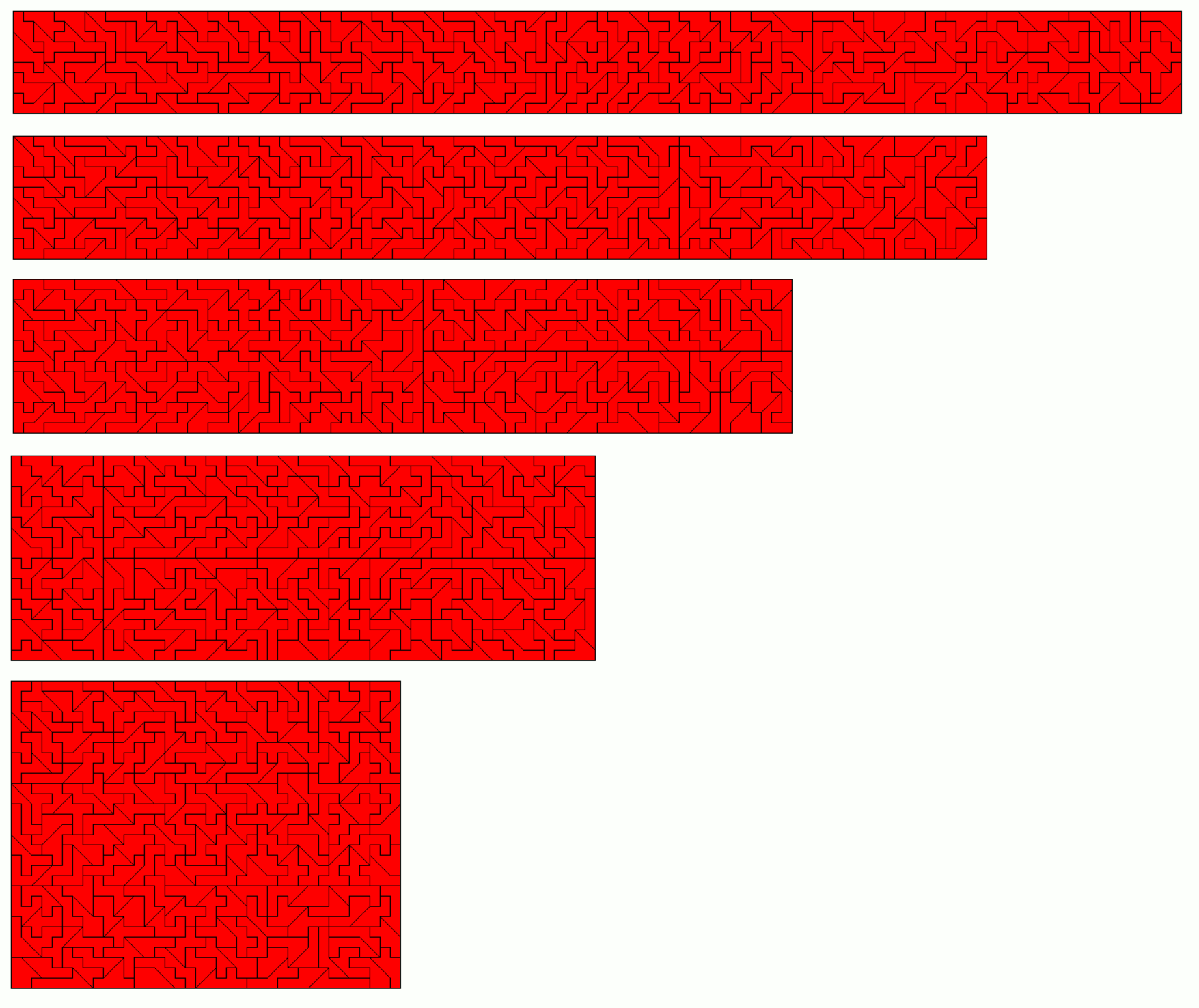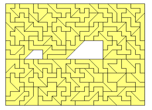 You can also look for rectangles with holes shaped like replicas of the pieces. Two examples for a 30x26 rectangle with a hole like a 5-fold copy of a piece is shown.