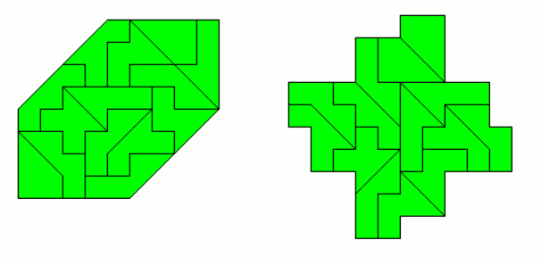 The two-sided set has only 8 pieces with a total area of 32 square units. Unfortunately a 8x4 rectanglecan't be packed with these pieces, but at least two figures with one axis of symmetry are possible to construct.