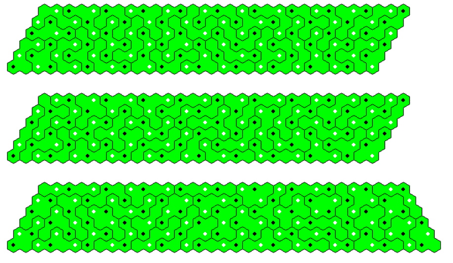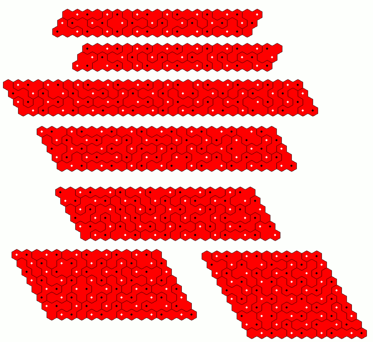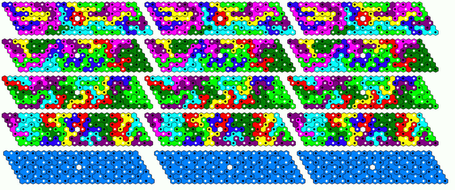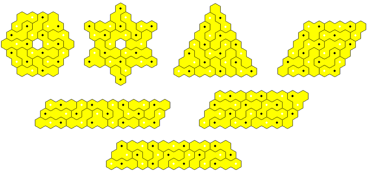 There are three pieces with a hole, so that constructions without holes must leave out these pieces and we get a total area of 432*6=2592 hexagons. Since 2592=18*144, I looked for 18 rhombs of side length 12. Choosing subsets of three pieces each, which only differ in a cyclic shift of grid colors we have enough subsets to construct 5 rhombs with only one piece of each subset. With grid color transform we get 10 additional rhombs. Beside the grid colors black and white pieces of same shape are same colored to show the equal composition. The remaining pieces can be used to finish the construction of the last three rhombs.