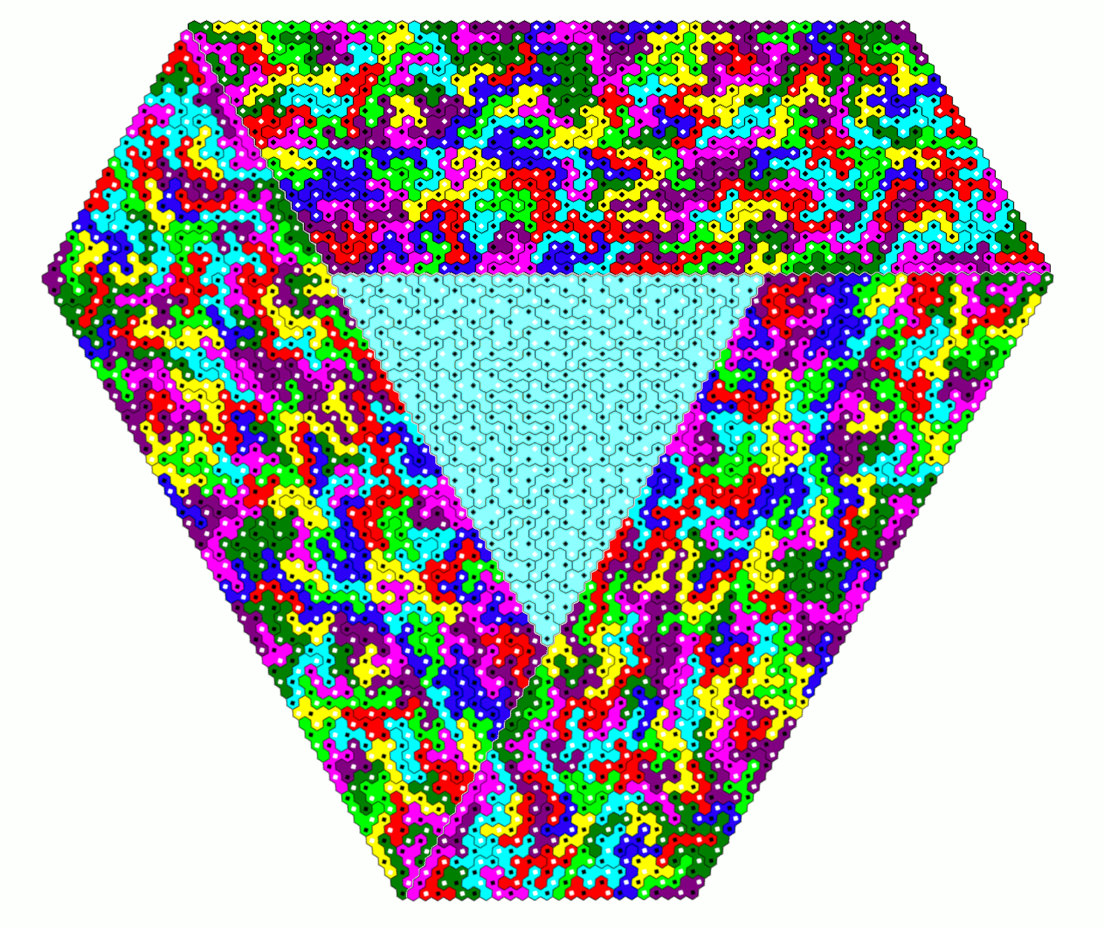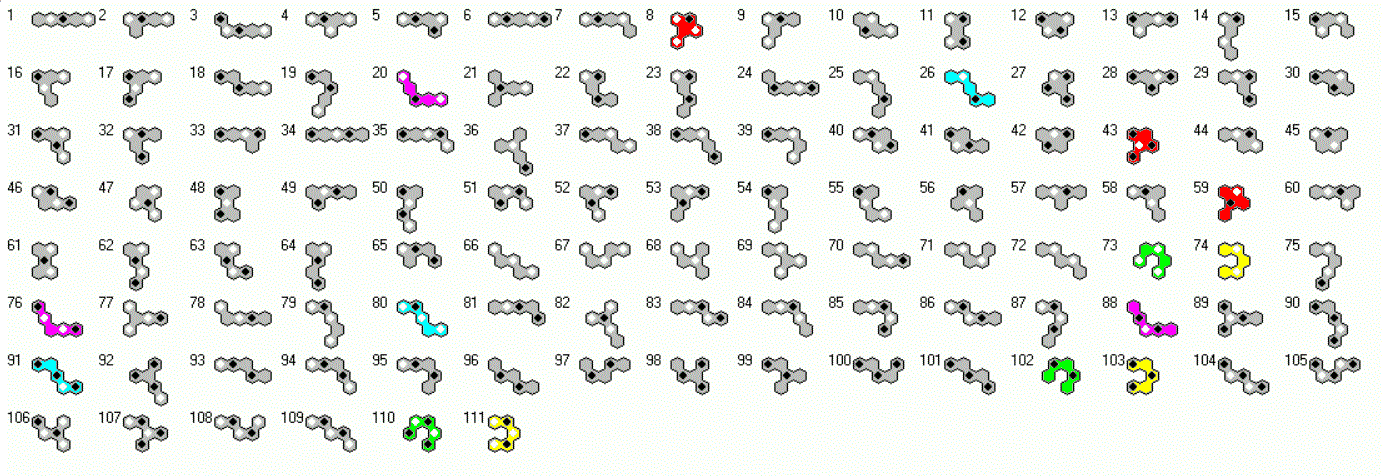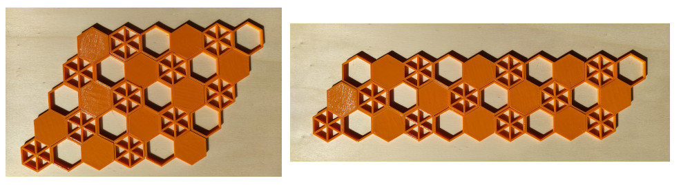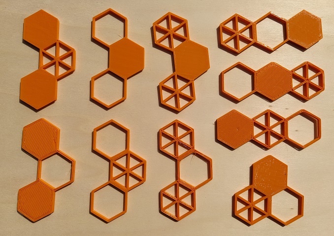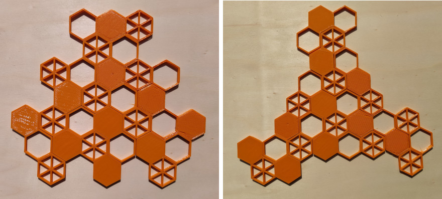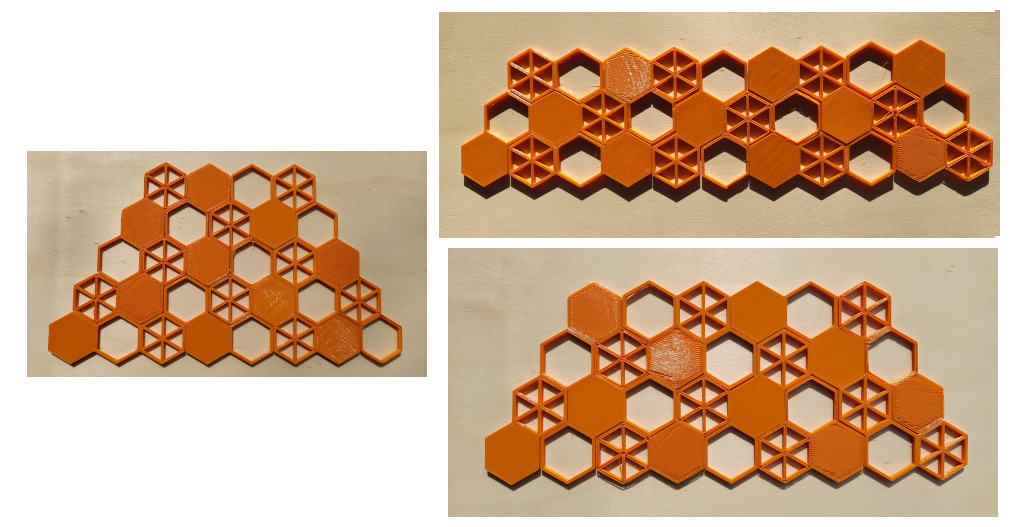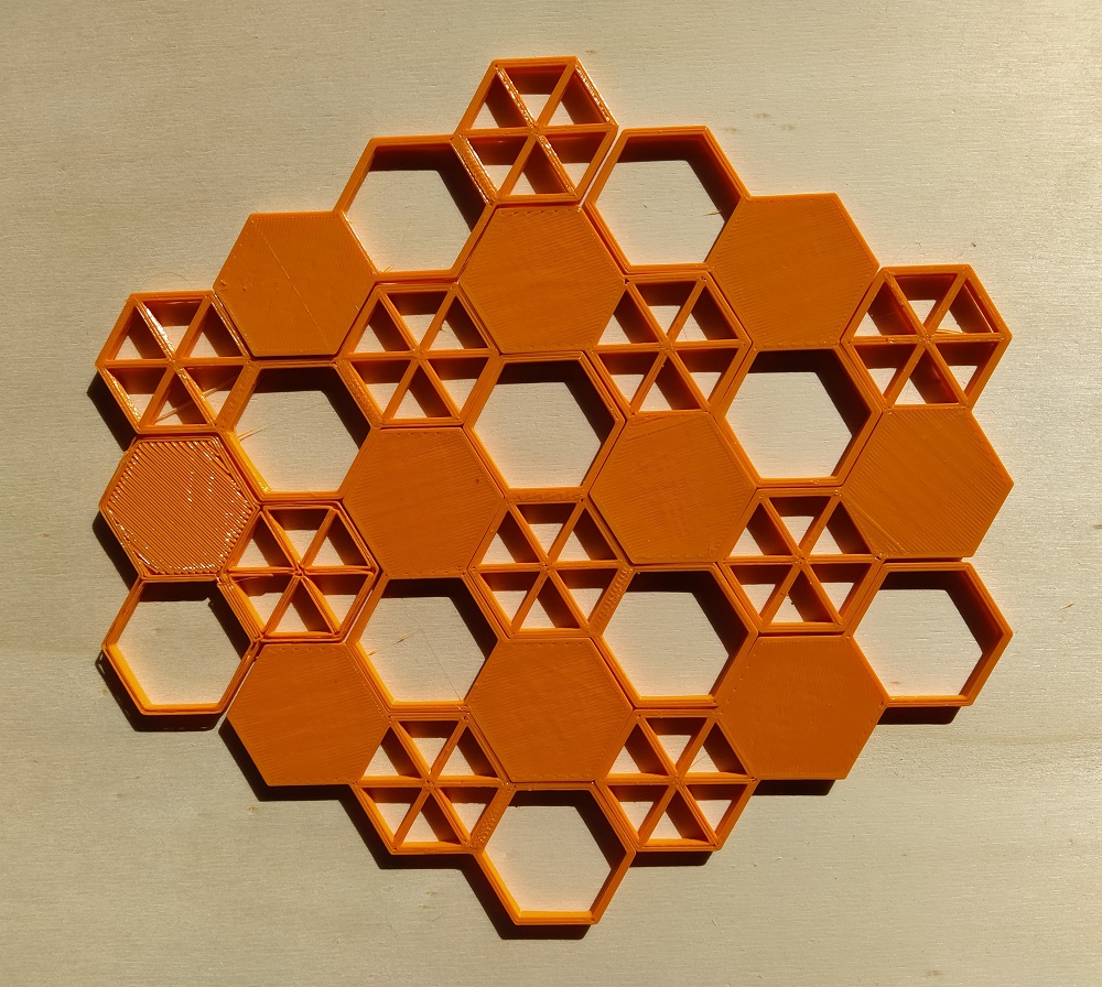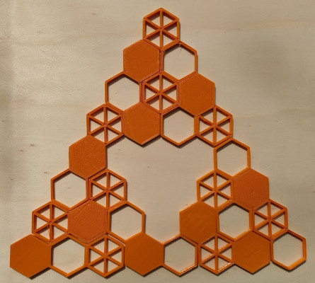 These are the printed pieces with a total area of 30 hexagons; the obj-files for these pieces are here. The three colors are replaced by three kinds of hexagons: solid, only border and with diagonals. The set is rather small and suitable to construct a lot of figures by hand.