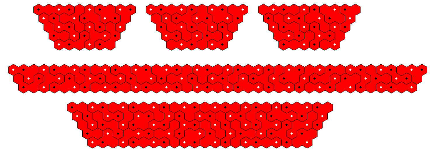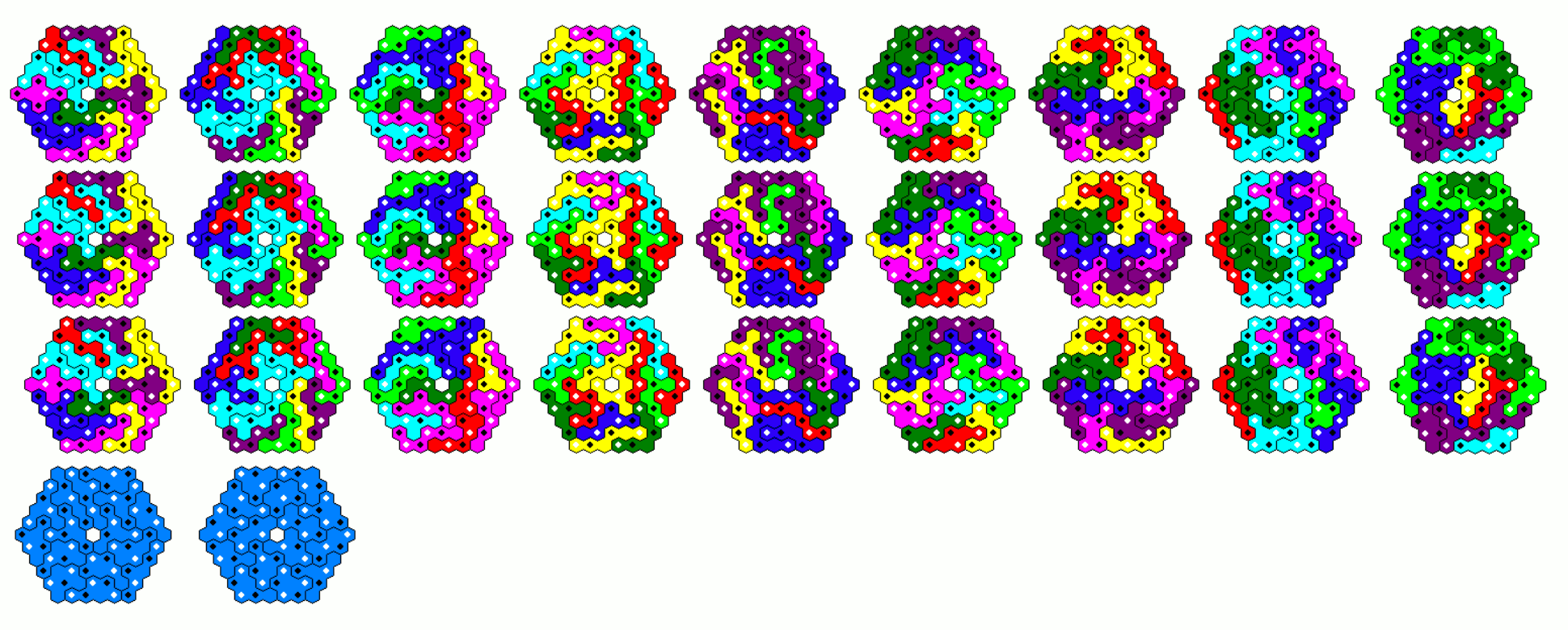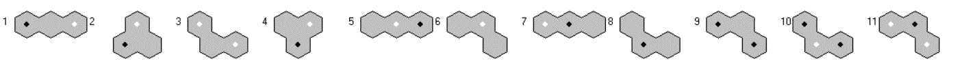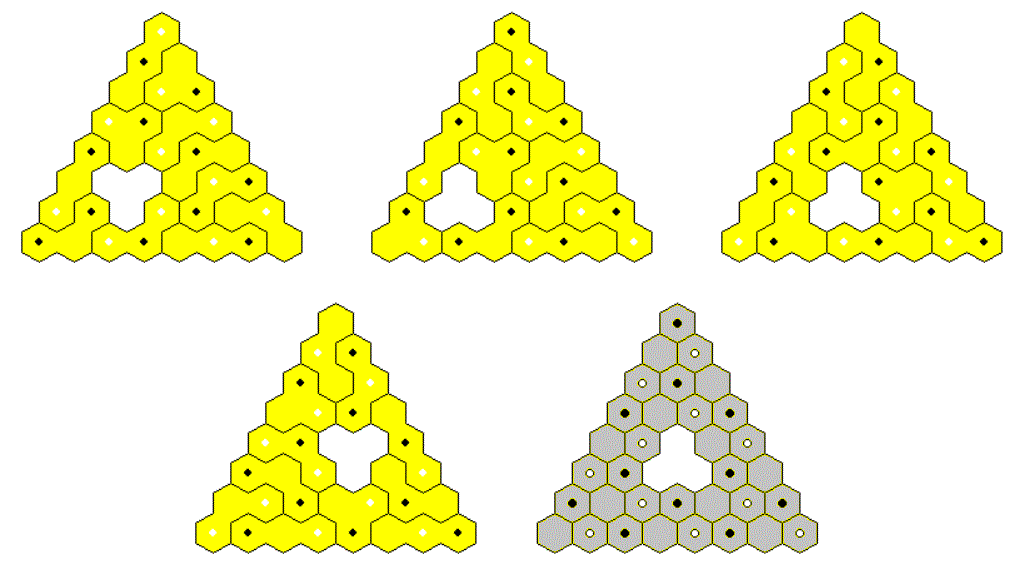 Here is the set of pieces with a total of 555 hexagons. Beside the three colors of the grid, which are marked by black, white or missing dots in the center of the hexagons, some subsets of same colored pieces are shown to indicate that these three pieces only differ in a cyclic shift of the grid colors (white > black > empty > white). Dividing the whole set into 37 subsets allows multiple constructions, if you make a figur using only one piece of each subset and get two other ones by transformation.