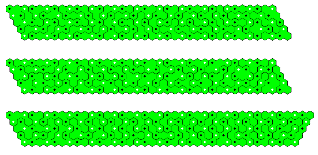The other ones can be combined in subsets of three pieces, where the pieces only differ in a cyclic grid color shift. With these pieces we can make five parallelograms of size 32x9 using only one piece of each subset. Then we get 10 additional parallelograms by color transformation. Joining the parallelgrams with their transformed ones we have five parallelgrams of size 96x9. With the remaining pieces we can fill parallelograms of size 32x9 and 30x9 to get a large parallelogram of size (5*96+32+30)x9=542x9.