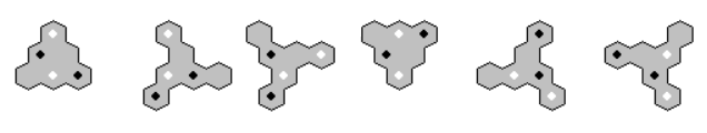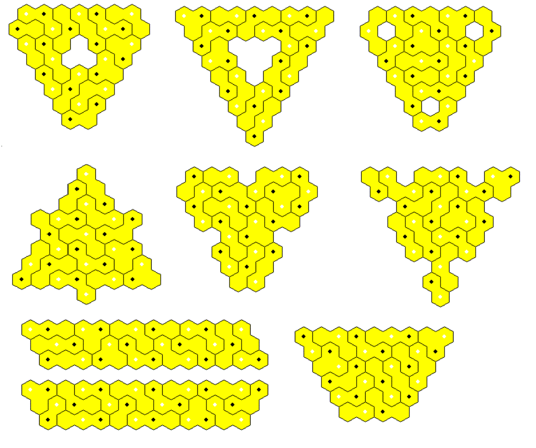 This set has a total area of 39 hexagons, which made it possible to construct figures with triangle symmetry. You can start with a trigangle of size 8 or 9 and subtract or add hexagons at symmetric positions.