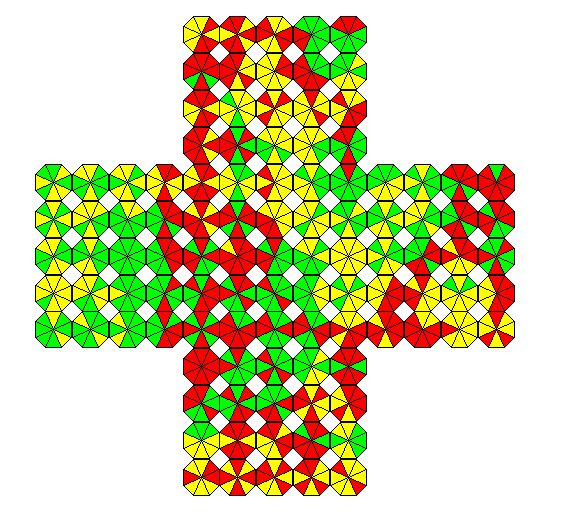 The picture above shows a construction choosing one or two colors out of three for the pieces. Typically pieces with many sides of same color are making kind of clusters.