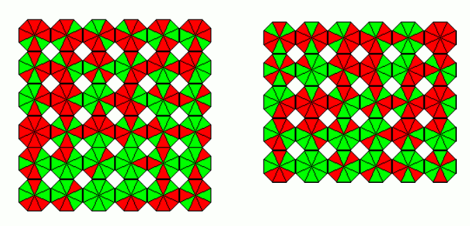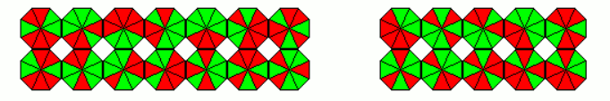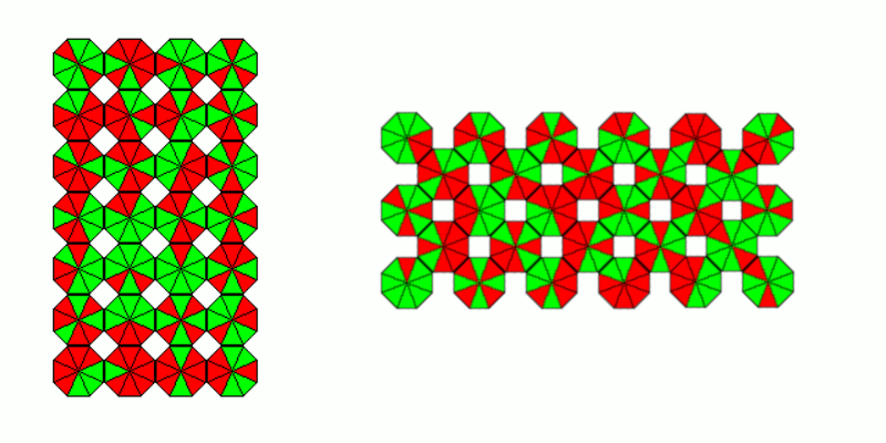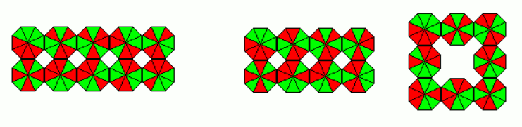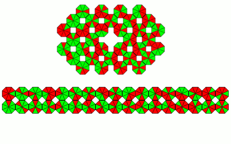 The 10 octagons can make a 2x5 rectangle and the 8 octagons a 2x4 rectangle or a ring of size 3.