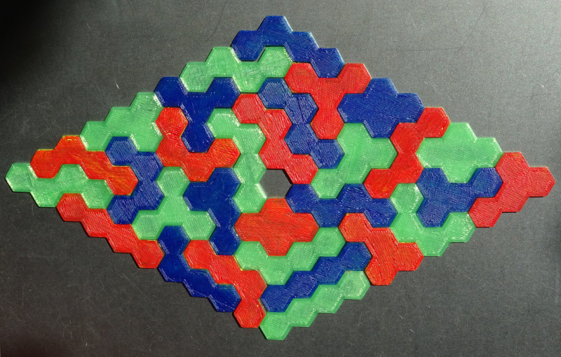 Jared McComb suggested taking three sets of these pieces with different colors. For construction he demanded that same colored pieces shoudn't touch and same shapes shoudn't touch either. I only took the first condition for my patterns and tried to find solutions with my old program for front and back colored polyforms. Unfortunately the source code was lost and the program failed solving larger problems. So I had to write a new one.