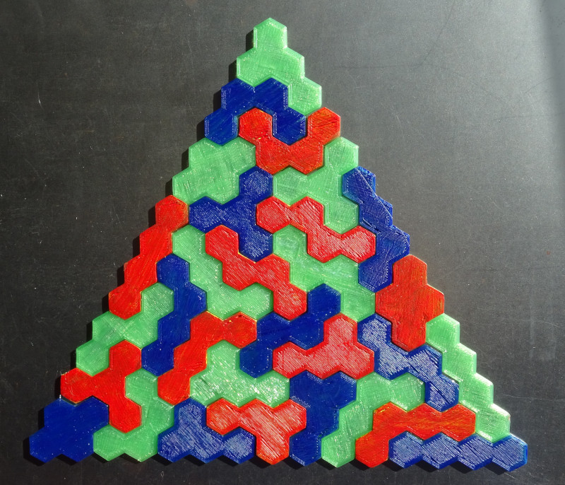 To get a physical puzzle I printed three sets of one-sided tetrahexes, colored one side of the pieces and attached magnetic foils to the other one. This way a construction is fixed and can easily be moved around.
