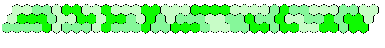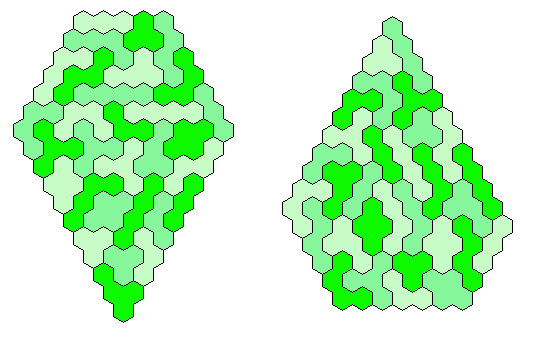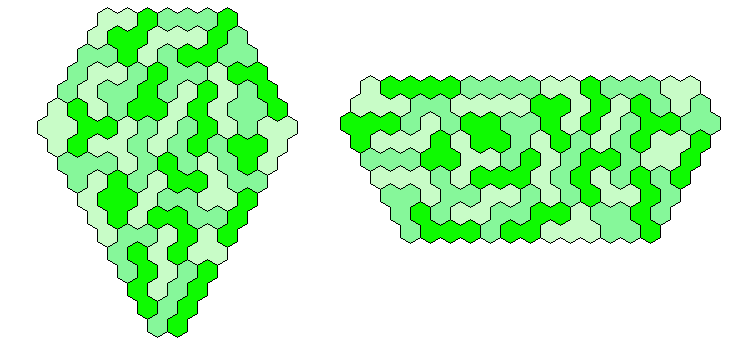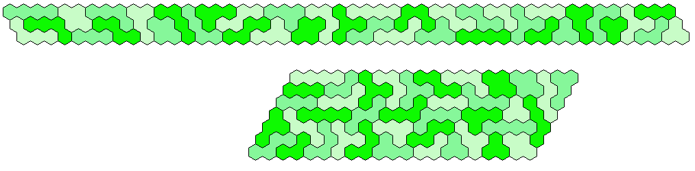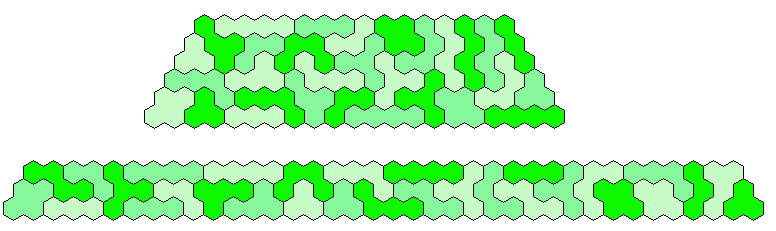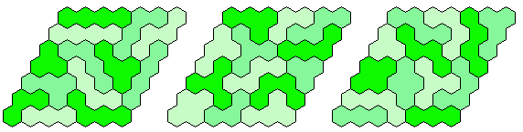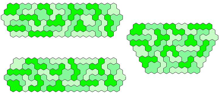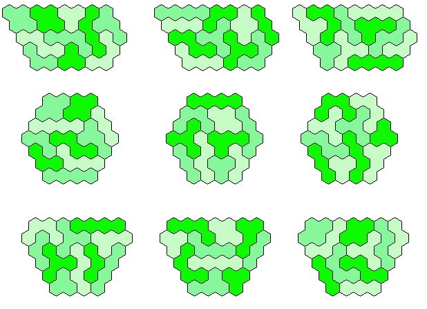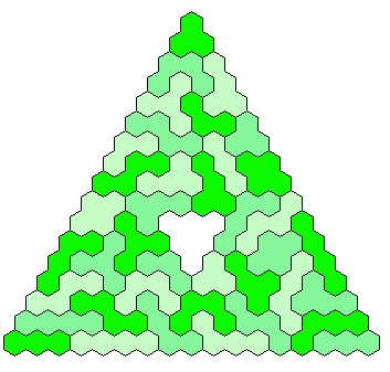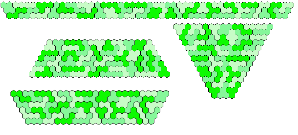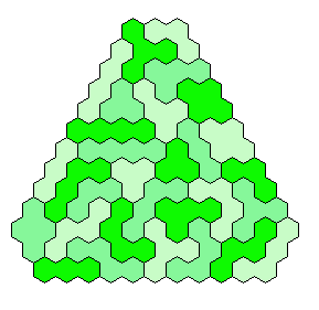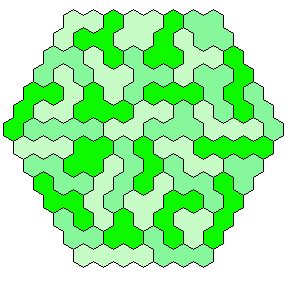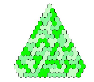 Because 37*3=111 and a size 4 hexagon has 37 single hexagons I tried to make three of them. Threefold copies of other shapes are also possible.