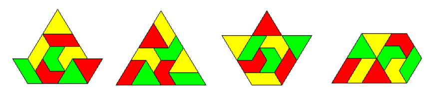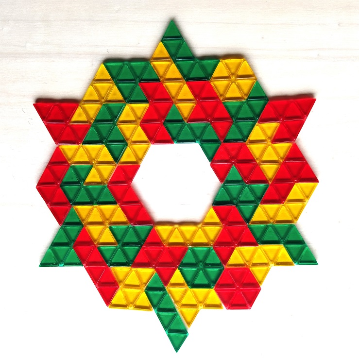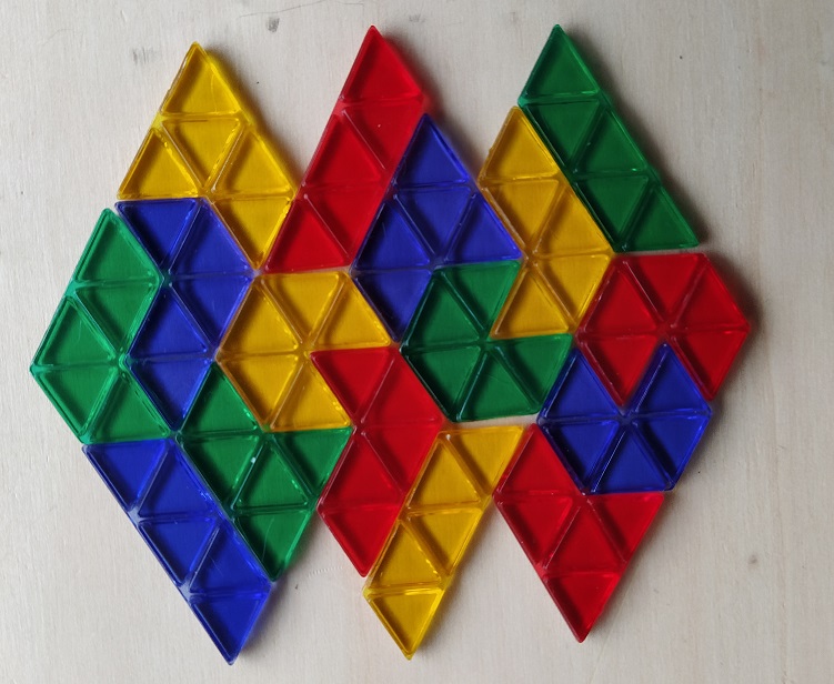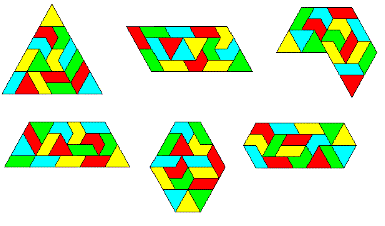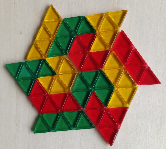 The total number of triangles in this set is the same number of triangles as the number of triangles in the four colored sets of two-sided tetriamonds. But now the total set is unbalanced and all figures of the last set cannot be constructed. Otherwise a triangle of size 6 with a center hole or with a missing corner are possible to make.