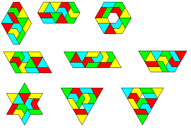 There are 3*24=72 pieces with a total of 504 triangles. Since 504 mod 6 = 0, you can make figures with hexagonal symmetry.