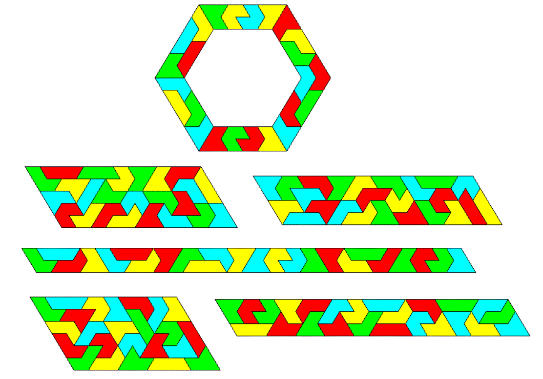 Three parts of the parallelograms 72x4, 132x6 and 39x8 are separately shown but can be combined without color problems. For the third parallelogram I copied the begining of the second part at the end of the first part to demonstrate the different colors at the border.