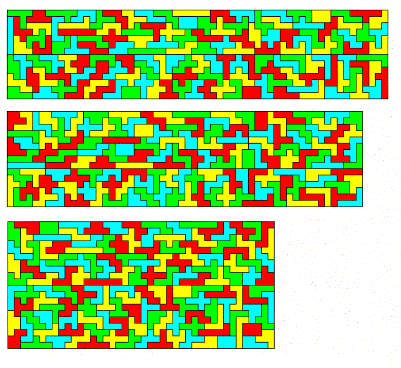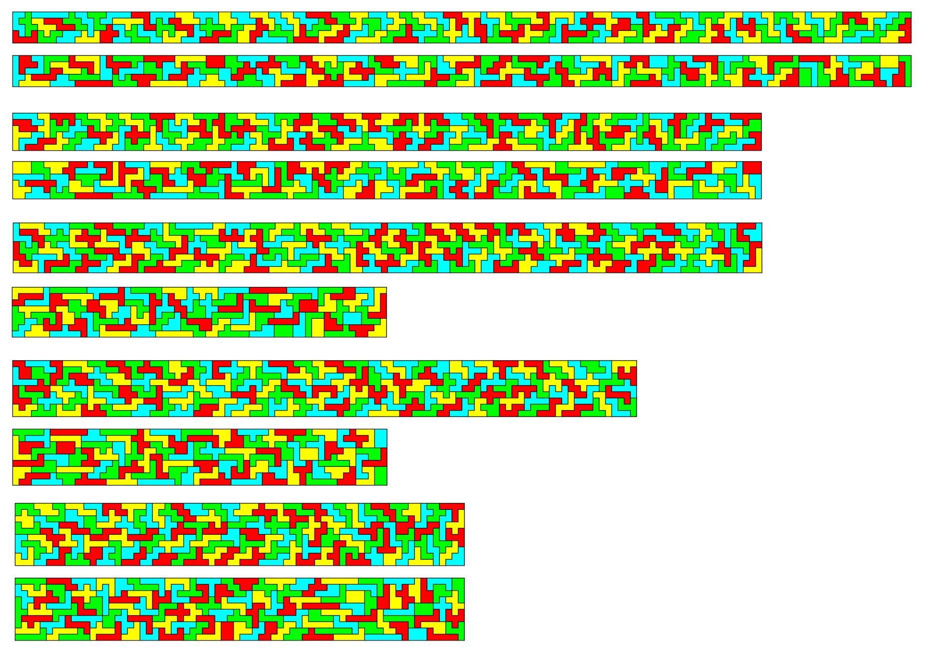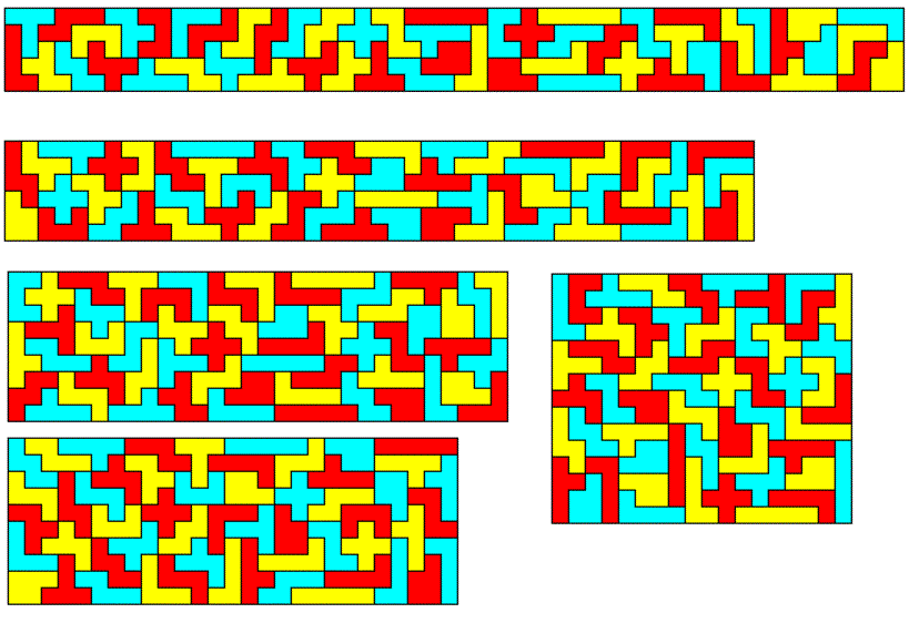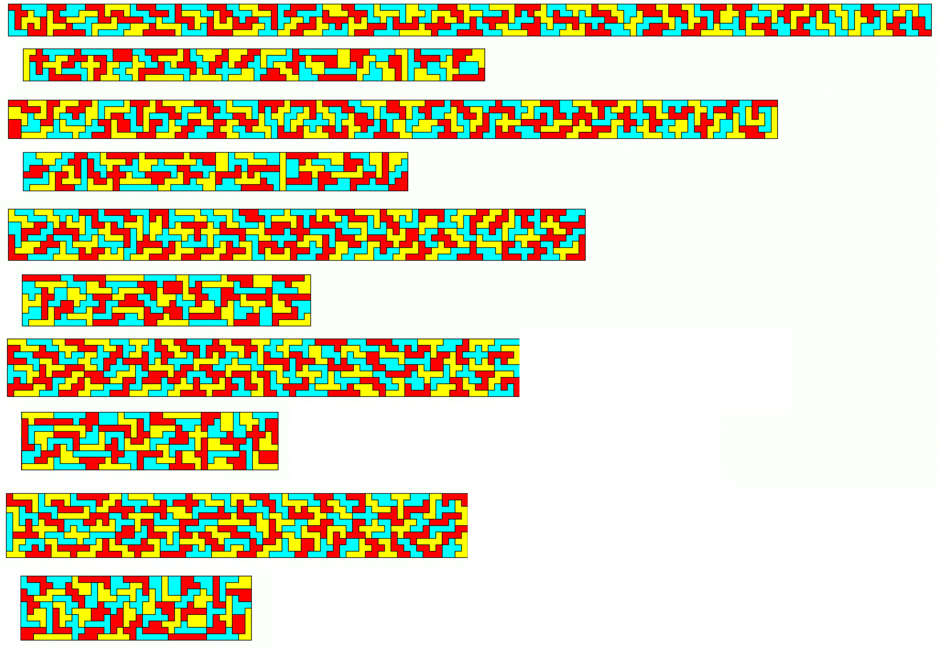 For the 60x3 rectangle a different approach was used. Since there is an almost unique solution for the 20x3 rectangle with the basic set, I colored this solution with three colors and got two other parts by a color shift. The three parts can be combined to get the final solution.