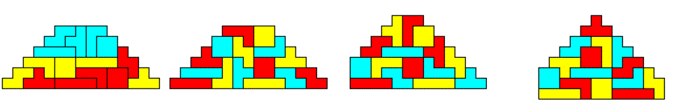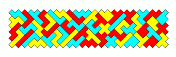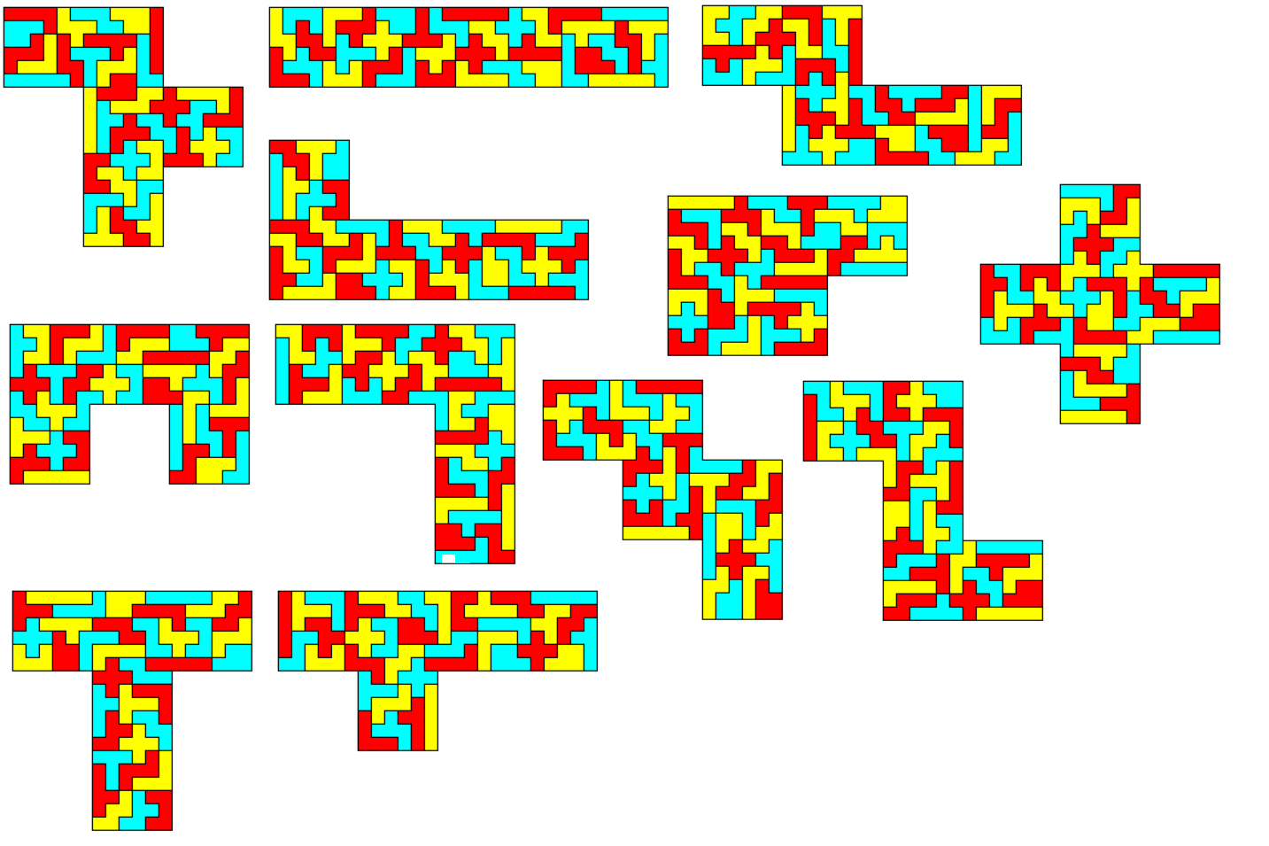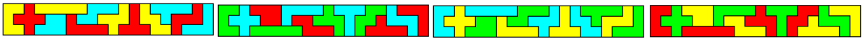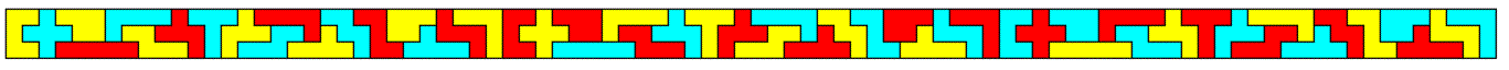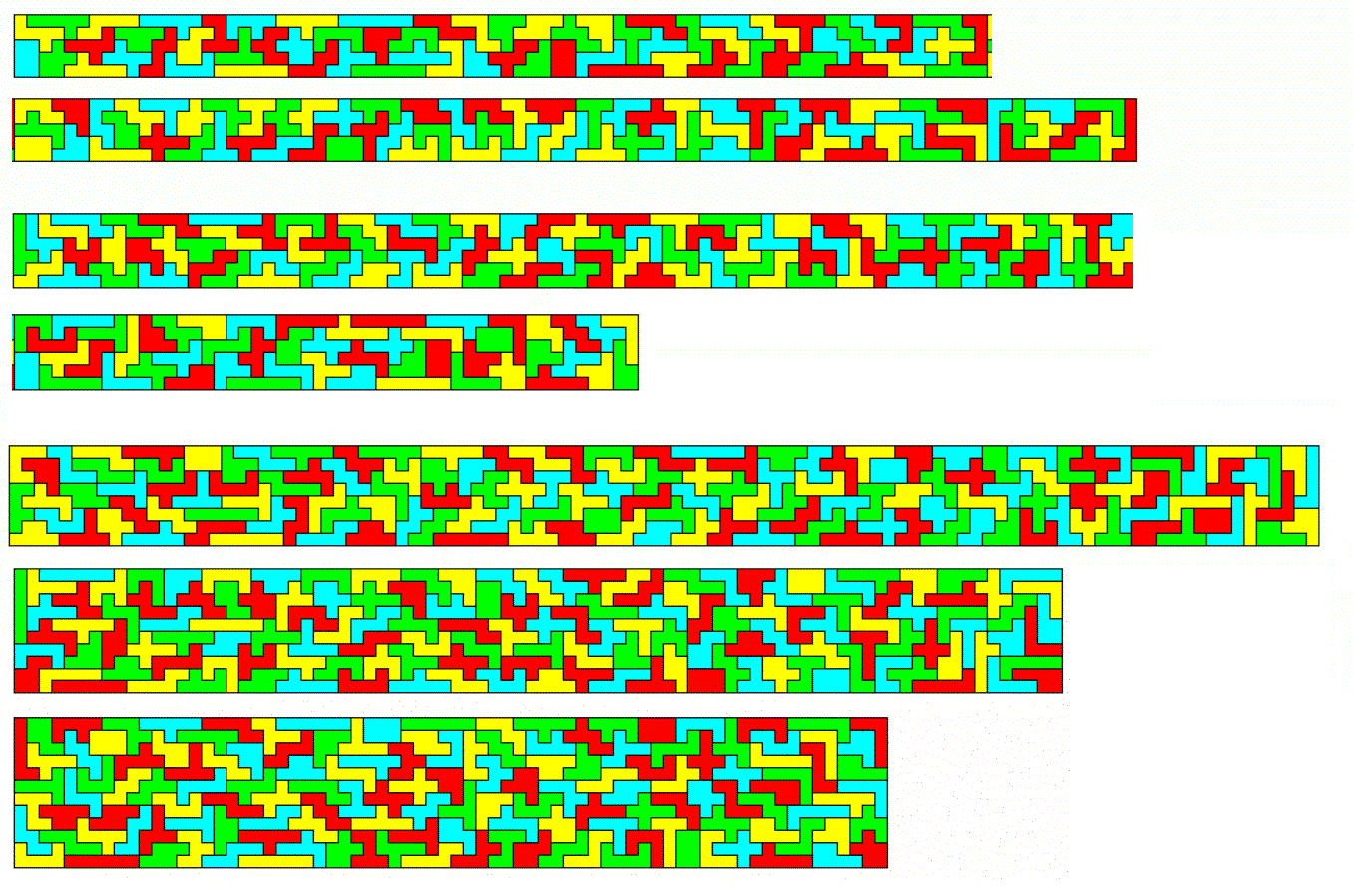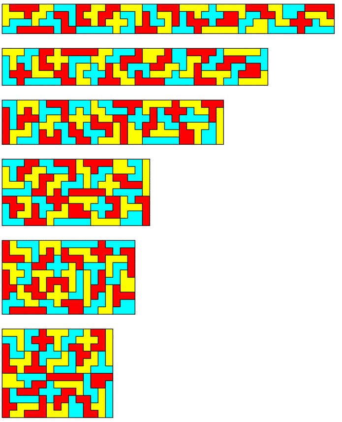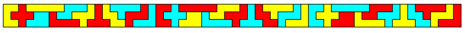 For the 60x3 rectangle a different approach was used. Since there is an almost unique solution for the 20x3 rectangle with the basic set, I colored this solution with three colors and got two other parts by a color shift. The three parts can be combined to get the final solution.