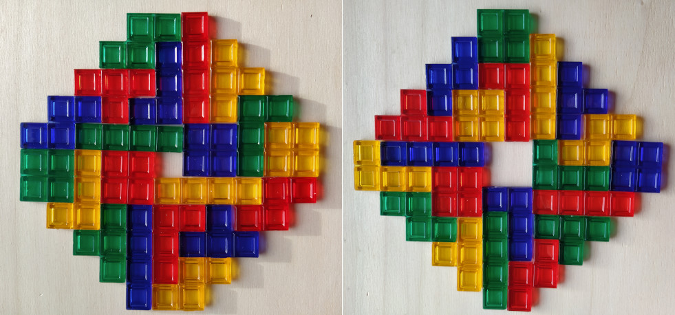 Other symmetric figures are also possible. I used real pieces to show jagged rings with square symmetry.