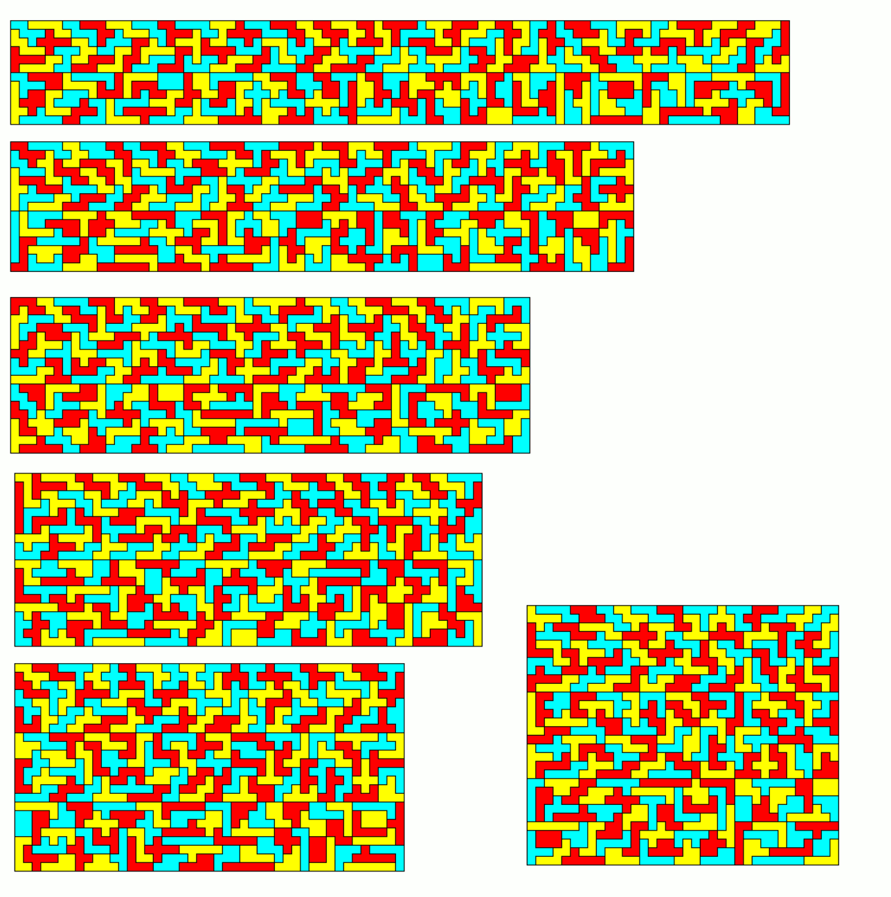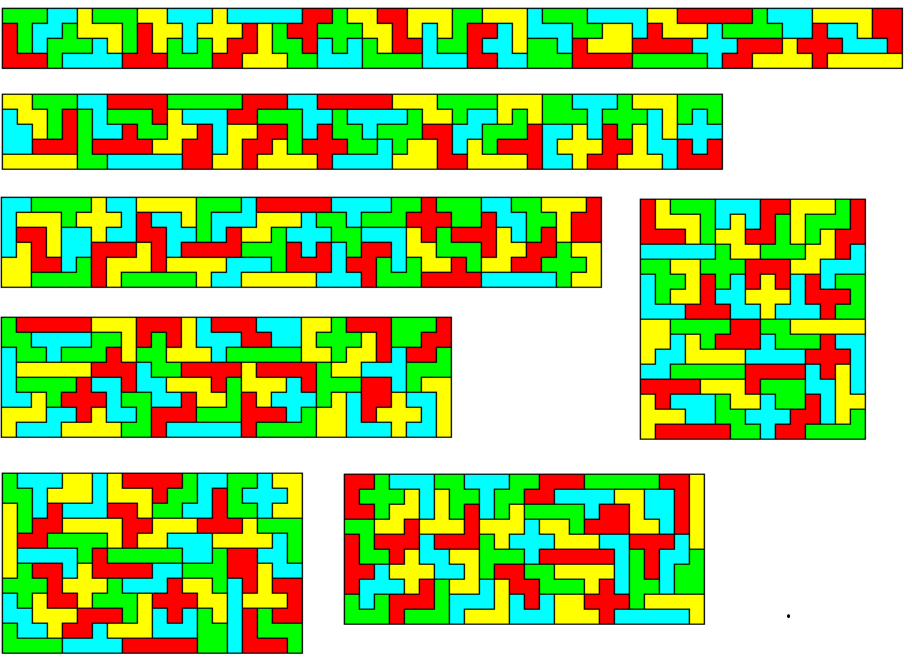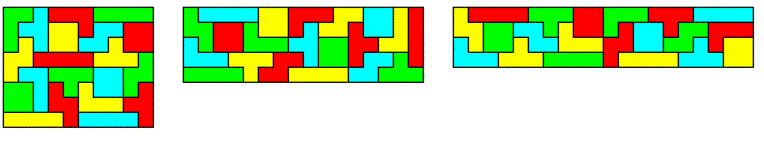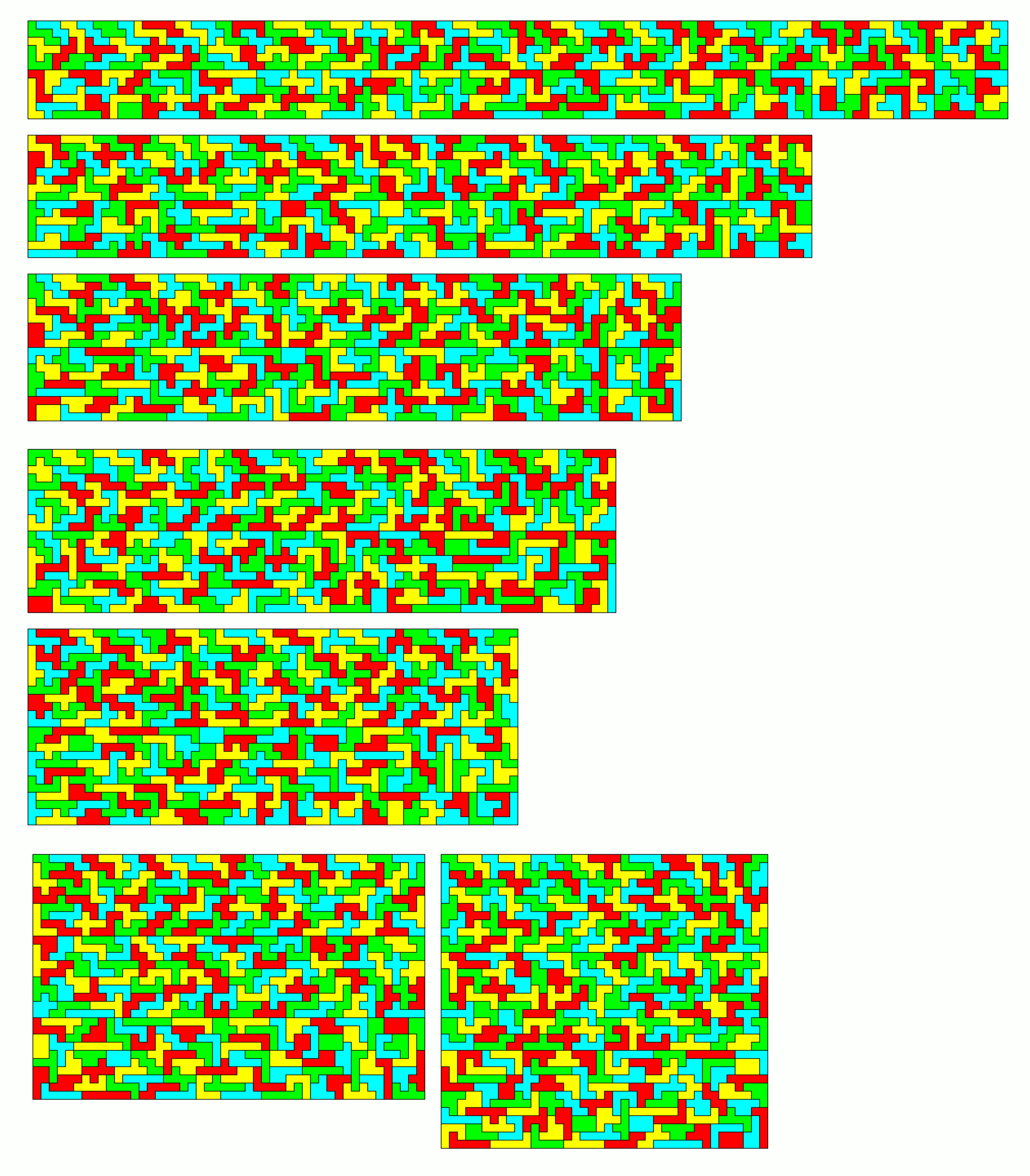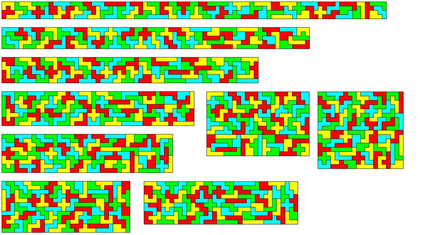 We have a total of 1440 squares and no parity problems, so that a lot of rectangles can be constructed. This was a little bit easier with four colors than with three colors. But I had to adapt the search program to accept larger areas. Rectangles with shorter sides less than 12 are: 288x5, 240x6, 180x8, 160x9 and 144x10.