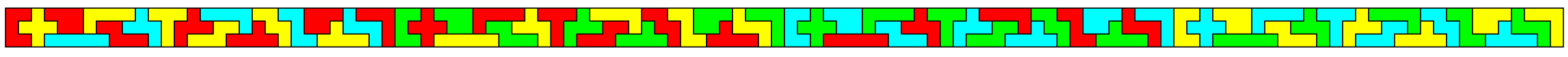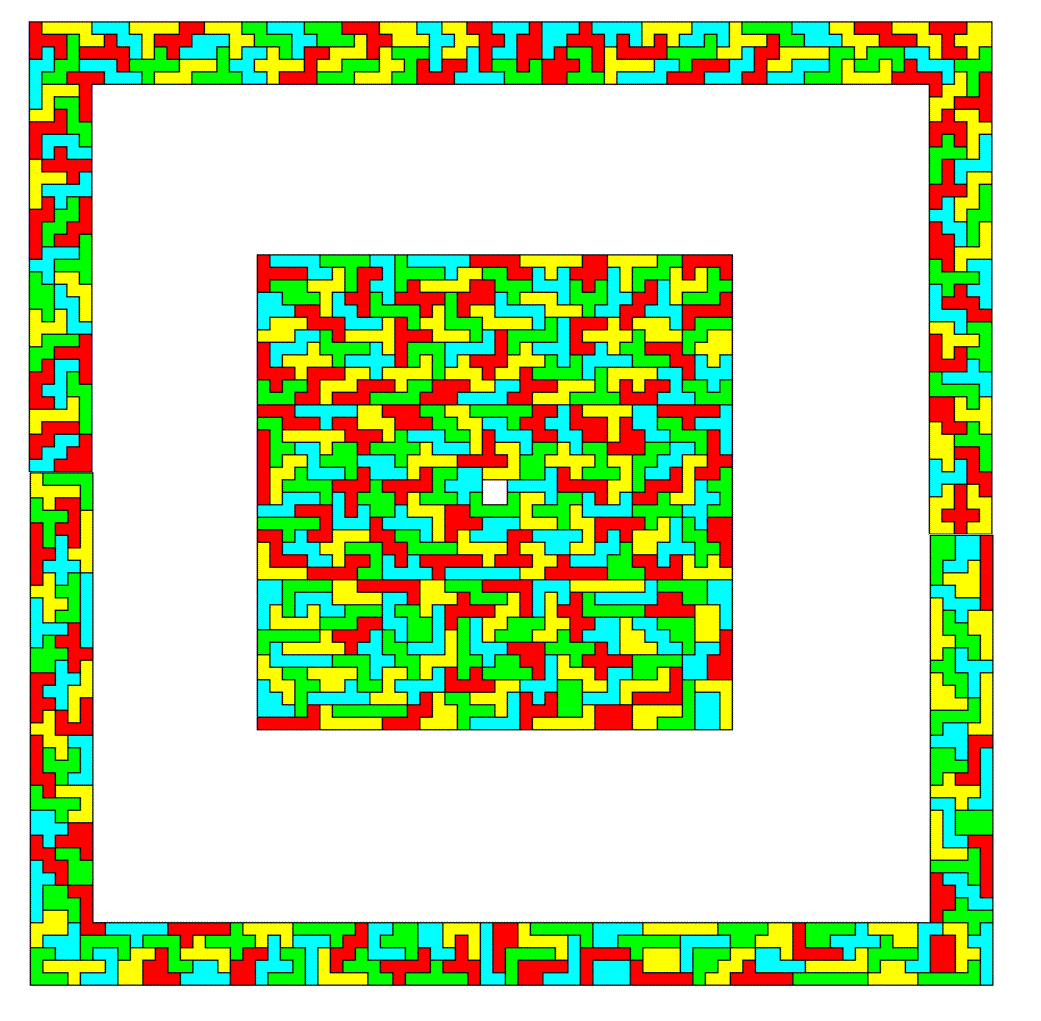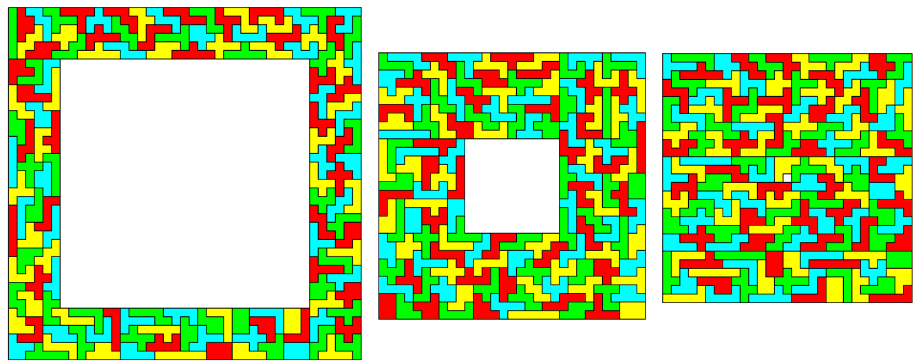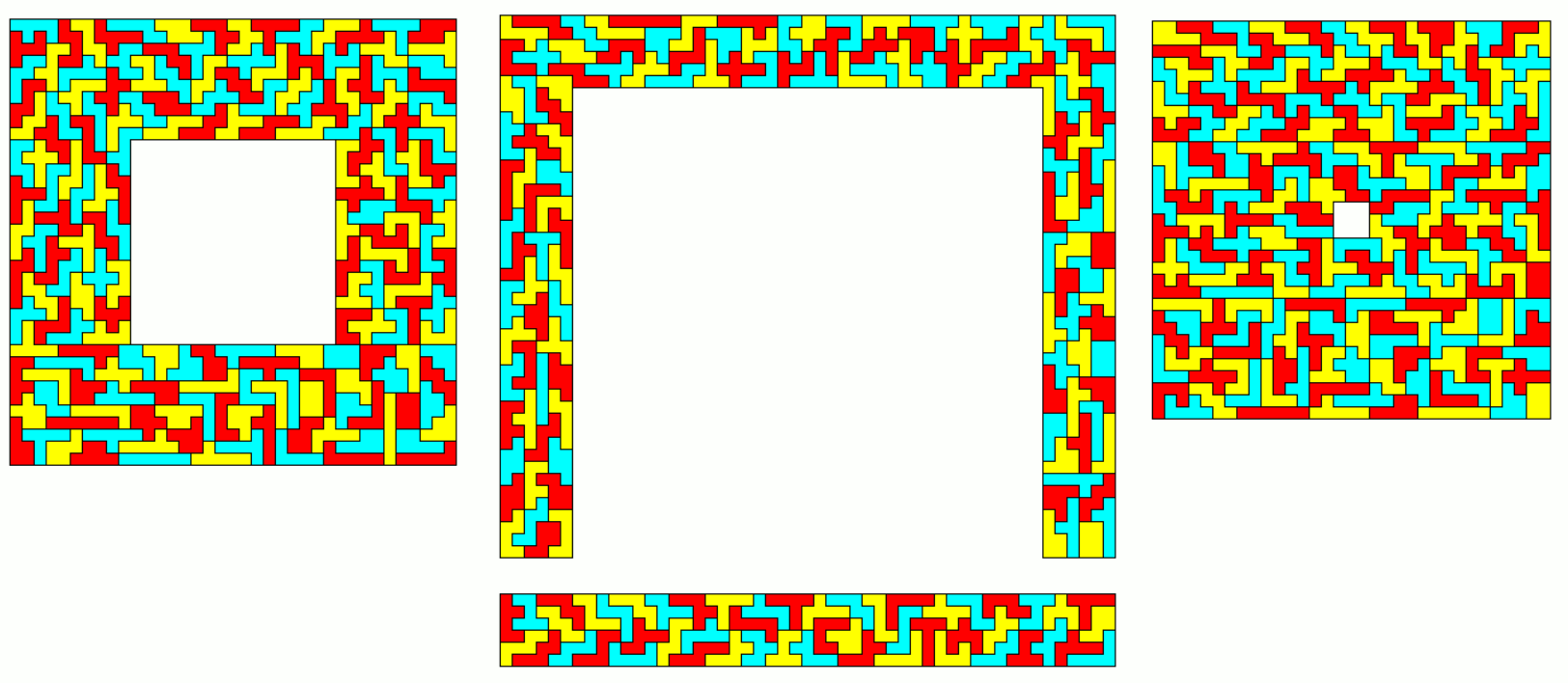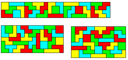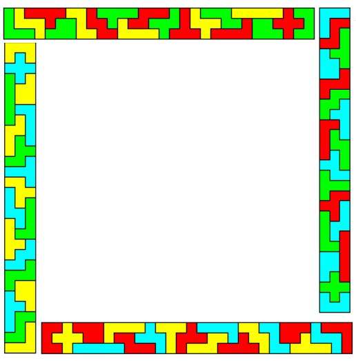 We have a total of 1440 squares and no parity problems, so that a lot of rectangles can be constructed. This was a little bit easier with four colors than with three colors. But I had to adapt the search program to accept larger areas. Rectangles with shorter sides less than 12 are: 288x5, 240x6, 180x8, 160x9 and 144x10.