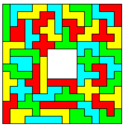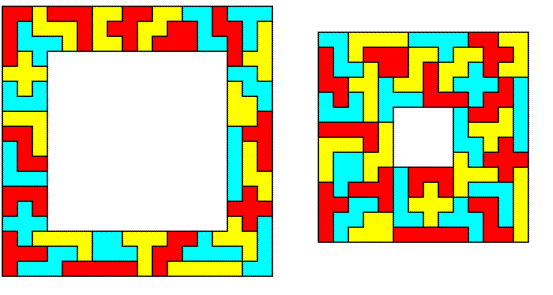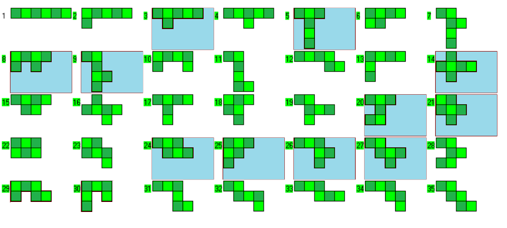 After this I explored three or four sets of tetrominoes, pentominoes or hexominoes. You can click the number of pieces in the table to see some constructions.