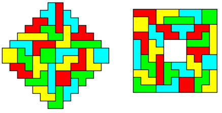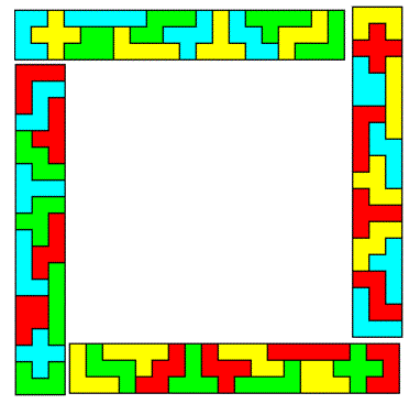 A jagged square with a center hole made from three sets of two-sided pentominoes can also be made.