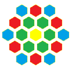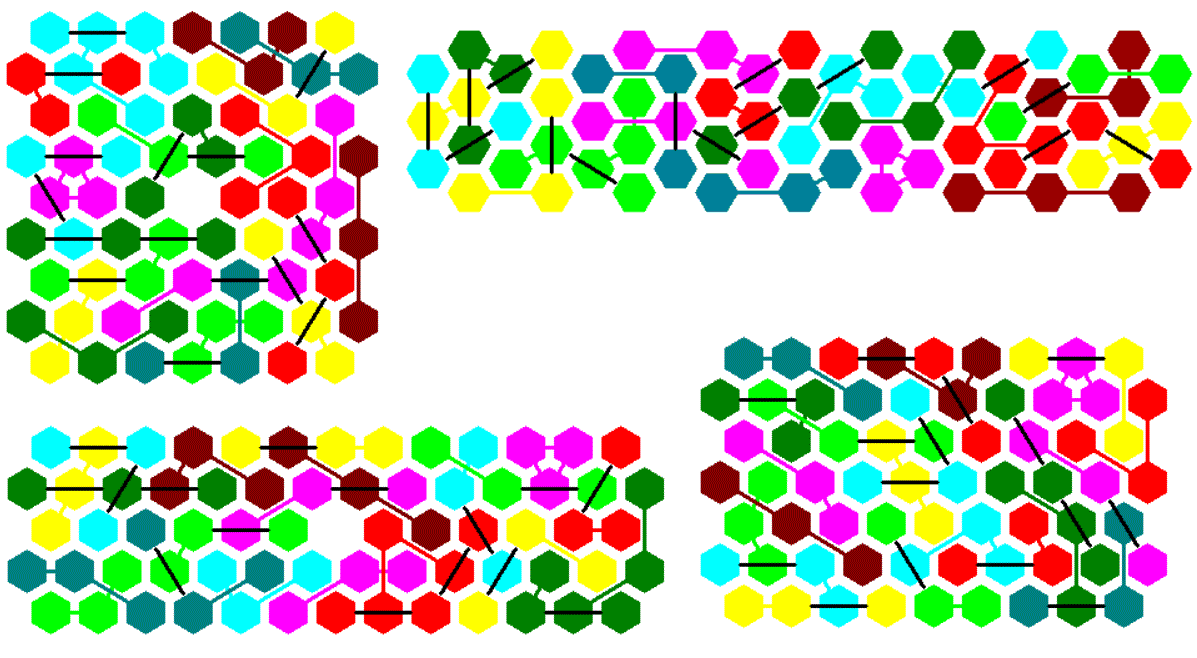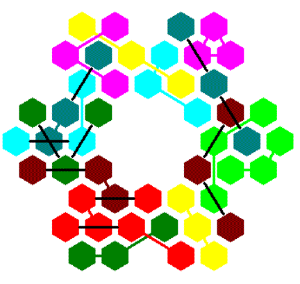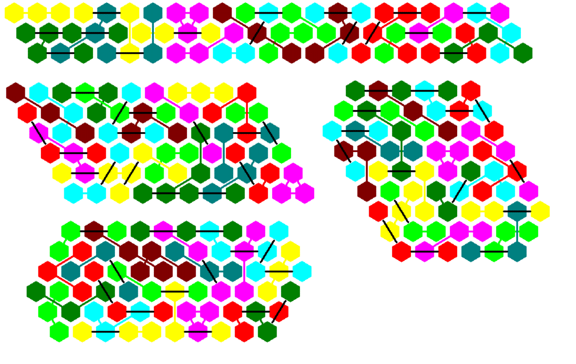 rounded or bridged polyhexes already discussed earlier. At last you may think of connections with distances of 2√ 3 between the centers of the hexagons, which skip over a whole hexagon. For the connections you need short bridges of length 1 and long bridges of length √ 3, respectively. The picture bewlow shows the three possible kinds of connections from the yellow hexagon. (sided by side with the green hexagons, short bridges to the red hexagons, long bridges to the blue hexagons)