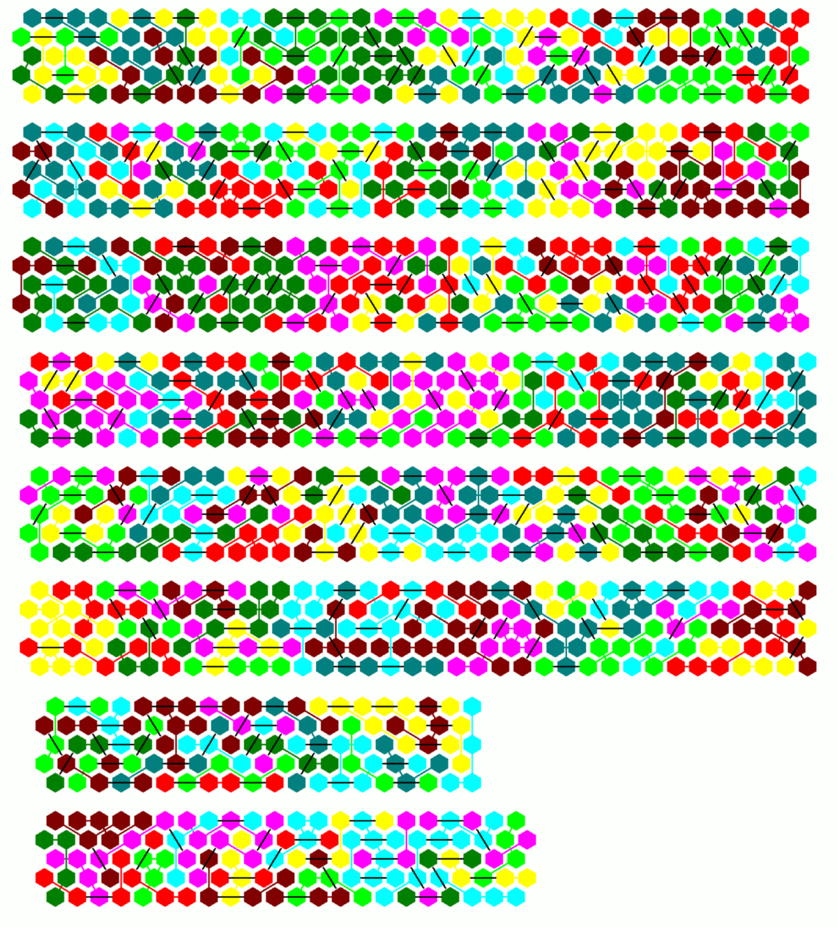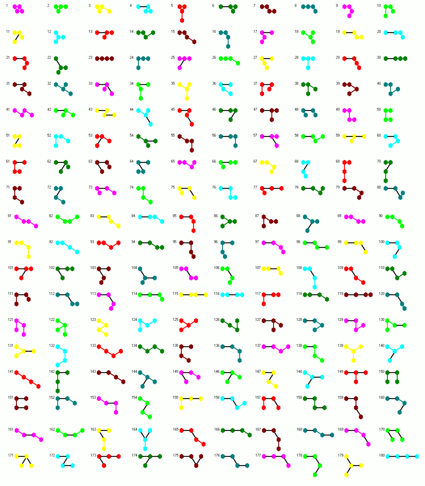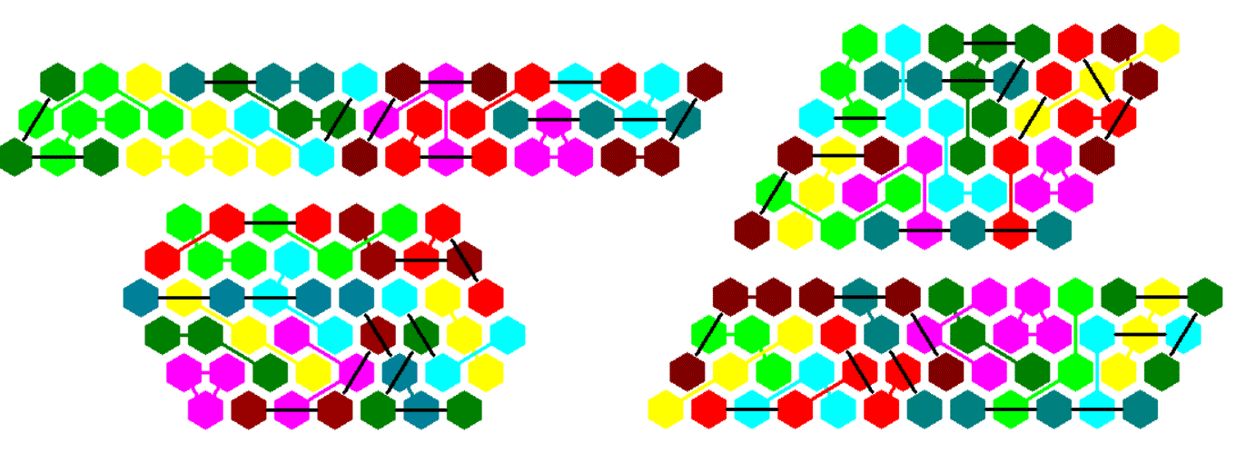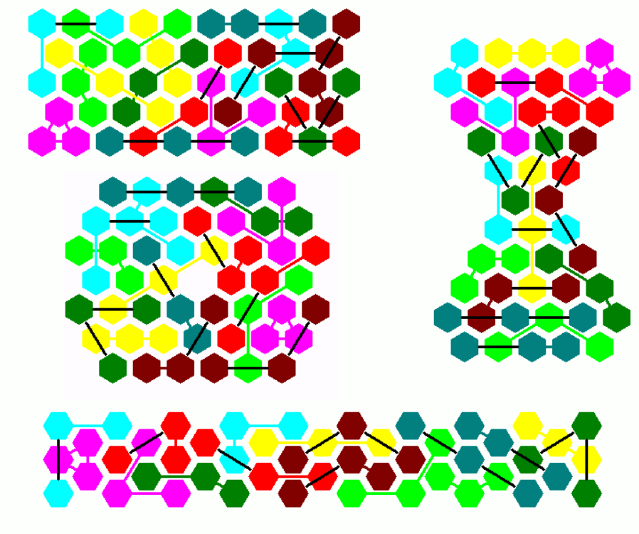 For sets of pieces with three and four hexagons I counted the number of pieces and made some symmetric constructions. Since the number of pieces grows very fast, we have already 2537 two-sided pieces with five hexagons. Click the sets in the table to see some examples for the smaller sets. The obj-files for the two-sided trihexes are here .