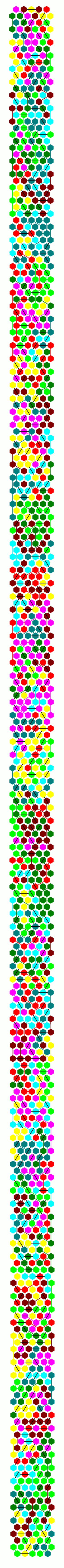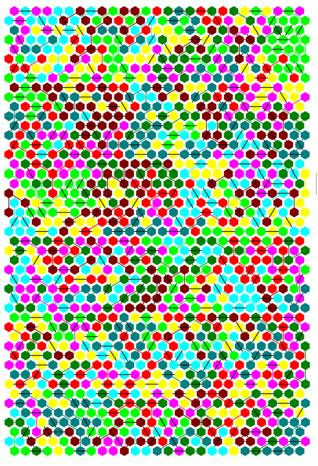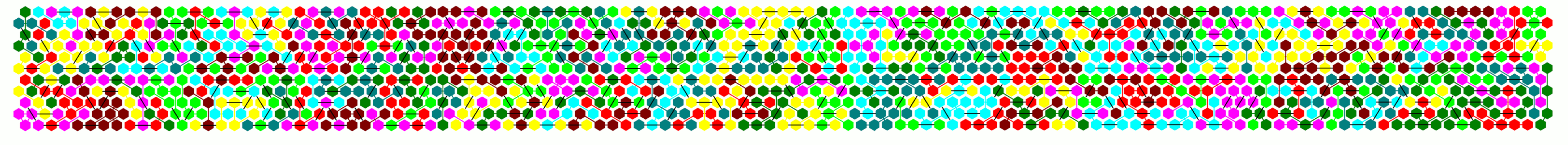 For sets of pieces with three and four hexagons I counted the number of pieces and made some symmetric constructions. Since the number of pieces grows very fast, we have already 2537 two-sided pieces with five hexagons. Click the sets in the table to see some examples for the smaller sets. The obj-files for the two-sided trihexes are here .