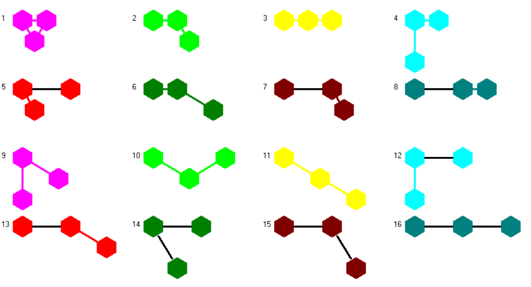 How can we count the number of possible pieces? Since closed loops of short or long bridges prevent constructions without holes, the bridges should produce a spanning tree with ordinary polyhexes as components. Let's have a look at some pieces with four single hexagons and three long bridges,where the positions of the hexagons are all the same. We have 3 two-sided and 5 one-sided different pieces due to the selection of possible bridges.