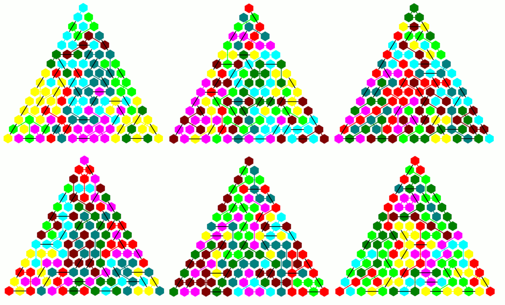 We can also divide the hexagon into six congruent triangles but it's harder to get a solution. There are three sharp corners to fill, and starting at the bottom the rows are longer than the columns in the solution with stripes. But at last I got a solution.