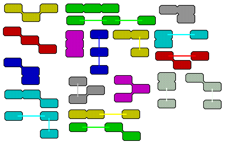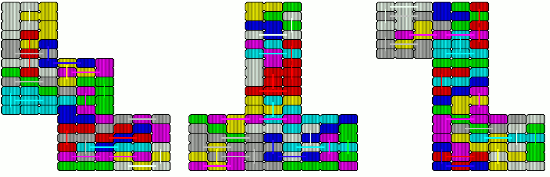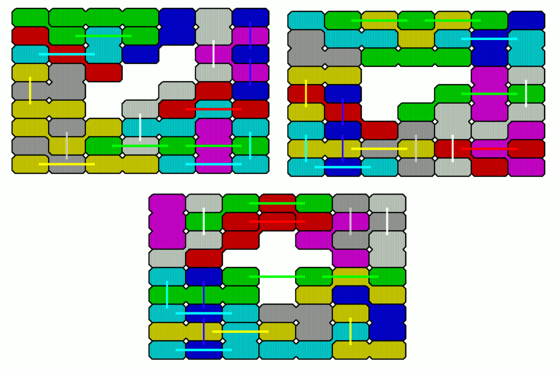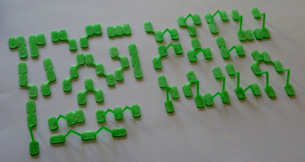 The set of one-sided pieces with three connected rectangles has 30 elements and a total area of 90 rectangles. The obj-files of the printed pieces are here, but solving problems by hand seems to be more difficult for this set.