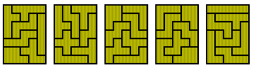 five same colored rectangles, and another solution where pieces of the same color don't touch?