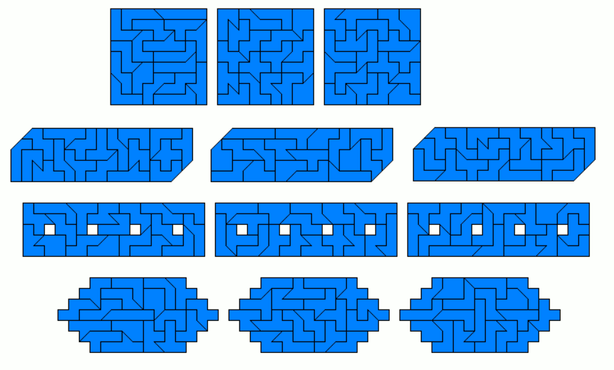 A symmetric hexagon and two symmetric octagons are cut from 14x14 or 21x9 rectangles. The heptagon isn't symmetric.