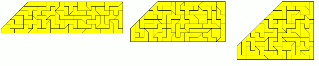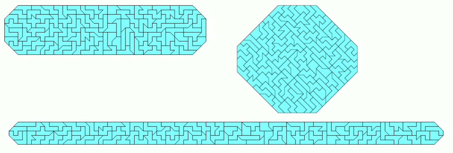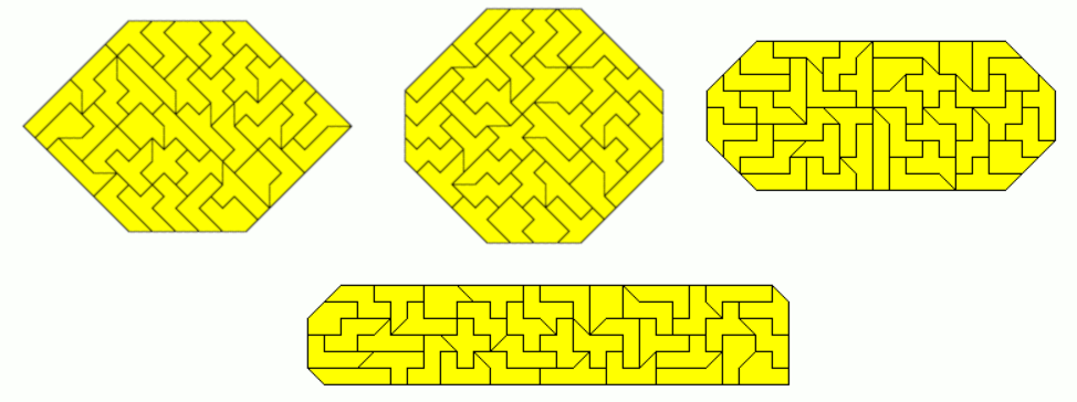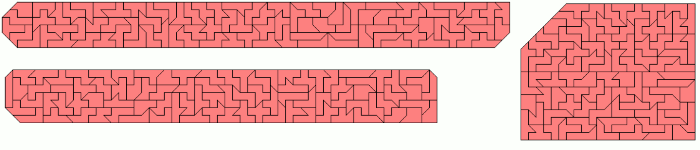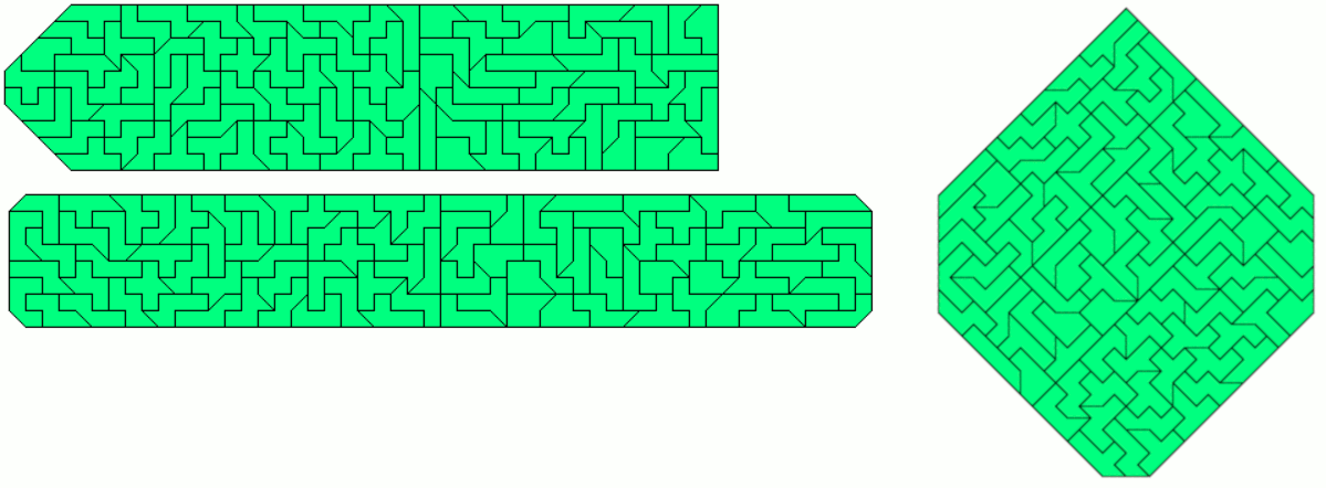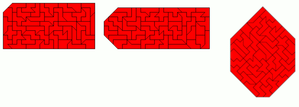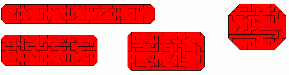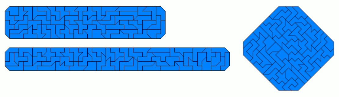 An example of a symmetric hexagon is a 49x7 rectangle with single tans cut off at two corners. Other hexagons are given by a pentagon made from two-sided pieces and its mirror figure. The octagon is a 43x8 rectangle without single tans at all corners.