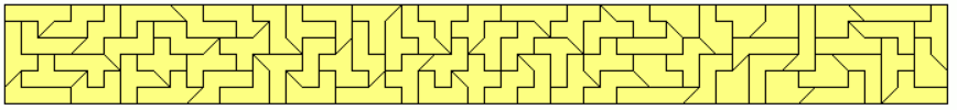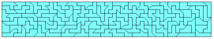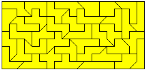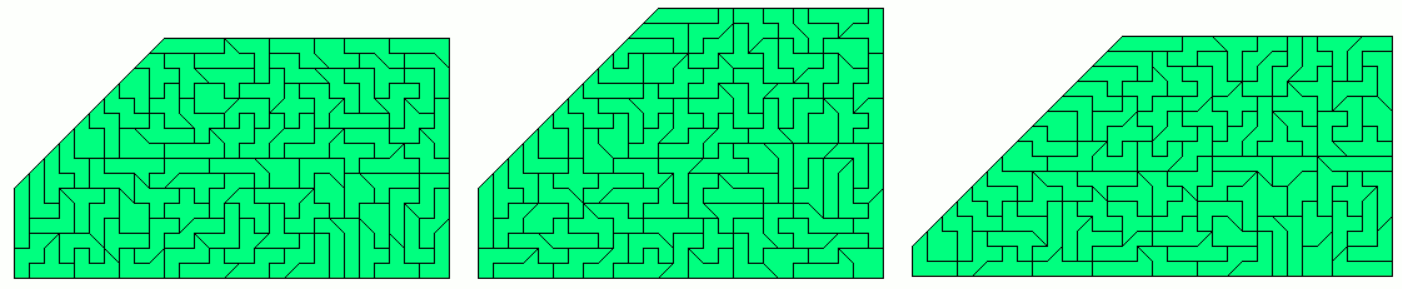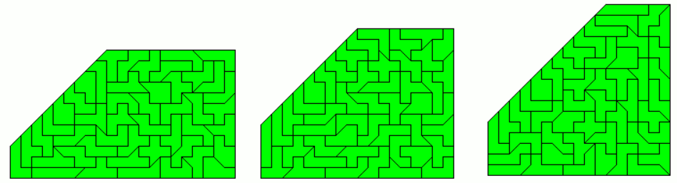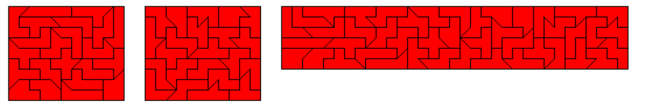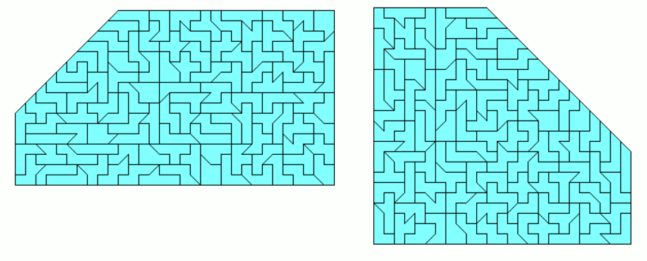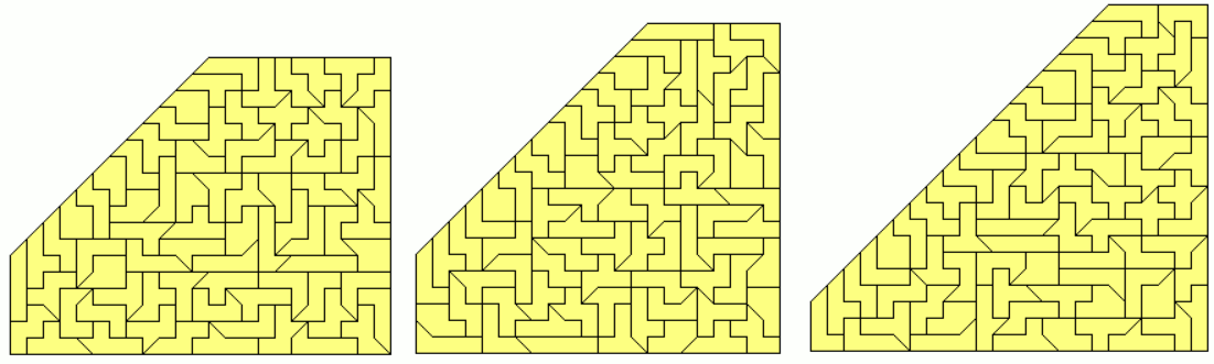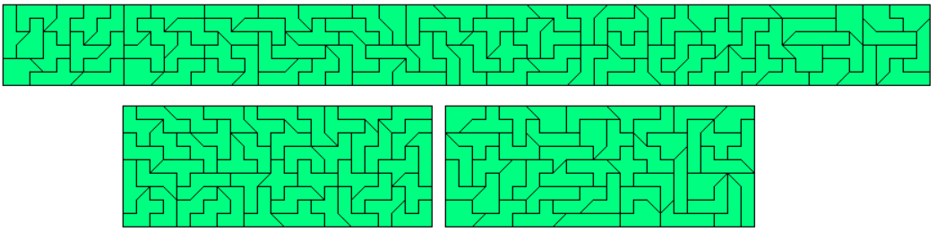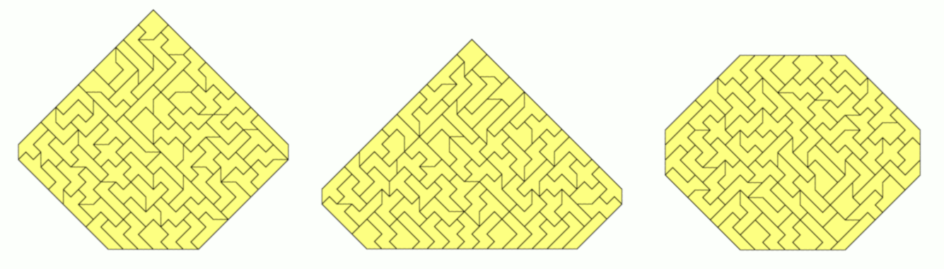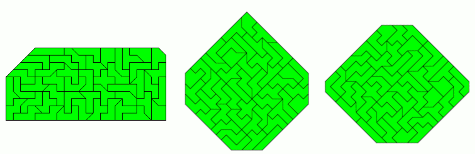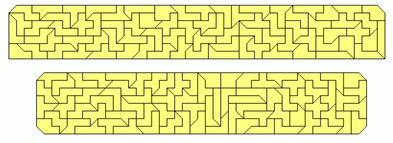 An example of a symmetric hexagon is a 49x7 rectangle with single tans cut off at two corners. Other hexagons are given by a pentagon made from two-sided pieces and its mirror figure. The octagon is a 43x8 rectangle without single tans at all corners.