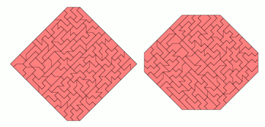 The left heptagon is a 19x19 square, where triangles of size 1, 6 and 1 are cut off. The second heptagon is a 21x21 square, where triangles of size 1, 14, and 1 are cut off. The octagon at the right has sliced edges of size 3, 7, 3 and 7 giving a total of 20 sliced squares at the edges. A 20x20 square was cut off.
