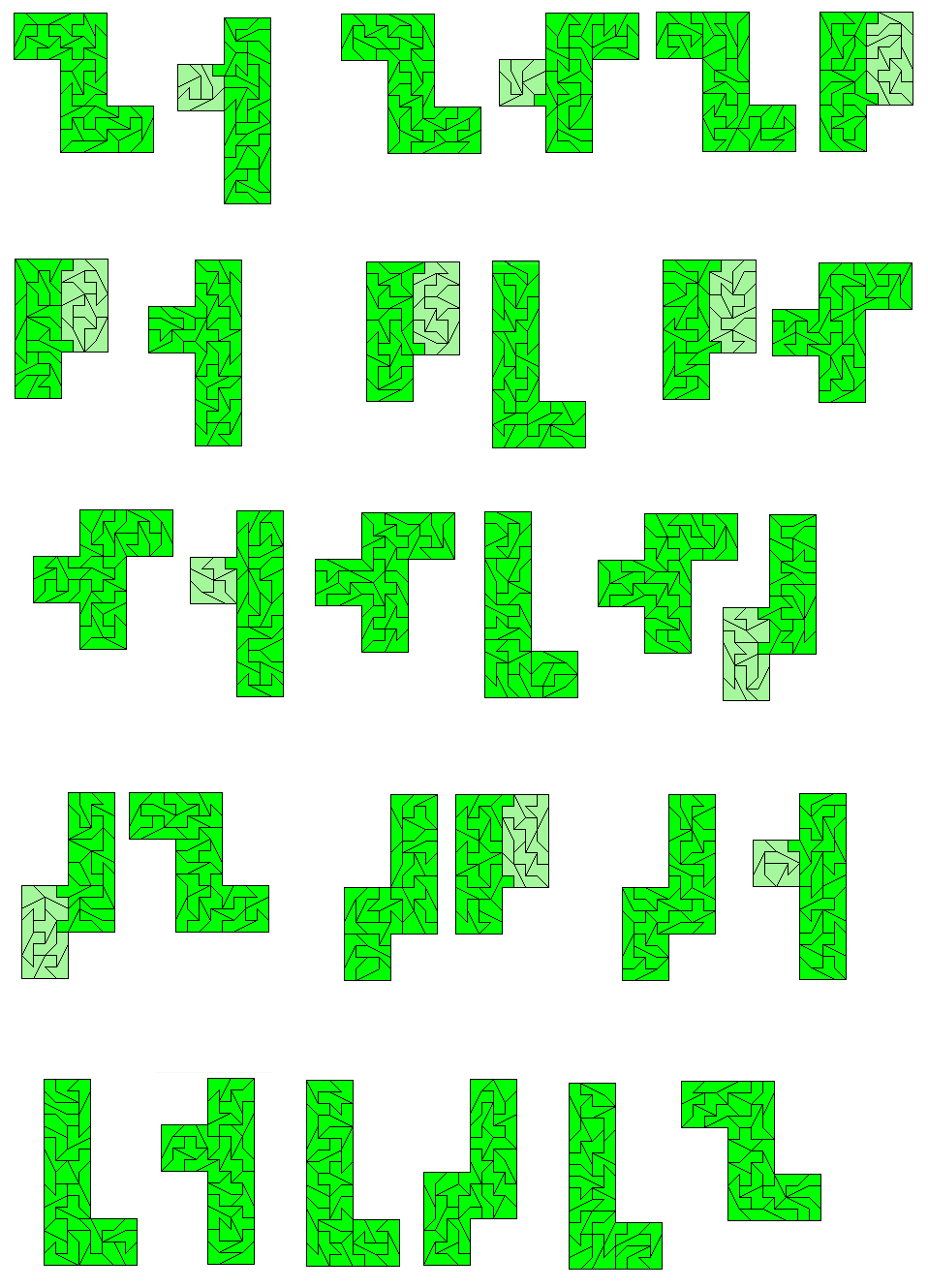 For these combinations the replica of the decomino is given by the replica of a single pentomino with the two-sided set and the reflected construction.